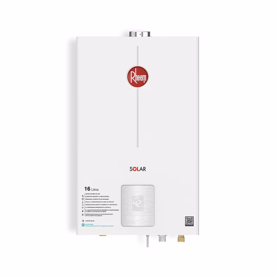 Calentador de agua a gas propano de 16 litros con tiro forzado y sistema digital. Proporciona agua caliente continua, temperatura estable y eficiencia en el consumo. Ideal para dos duchas simultáneas.