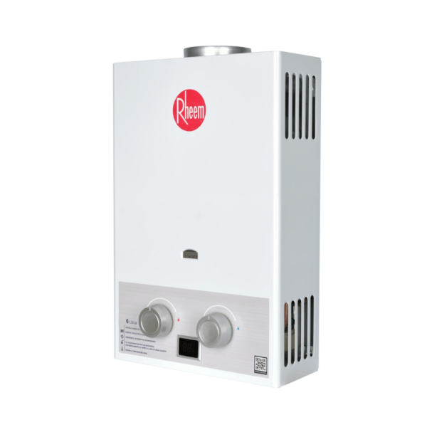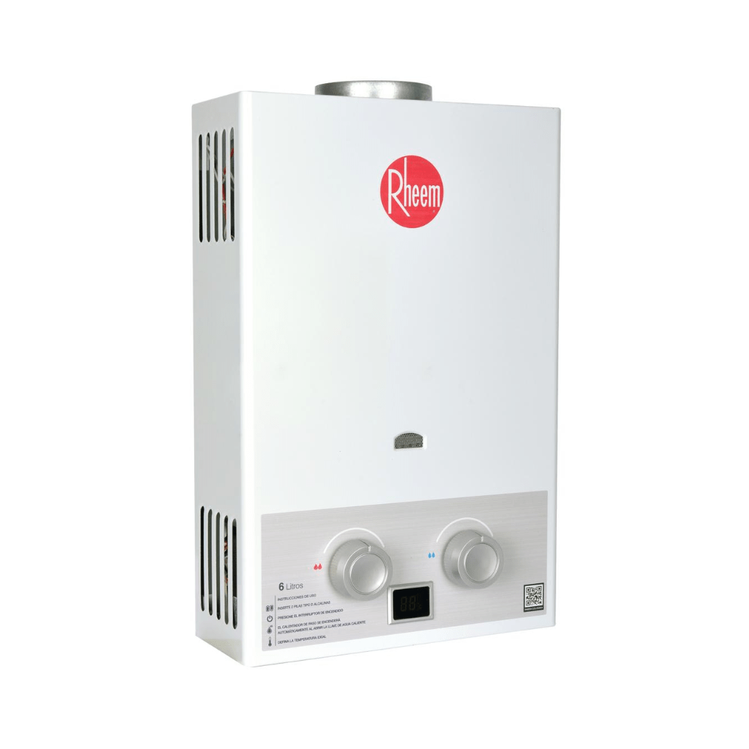 Calentador Tiro Natural de paso a gas. Encendido automático. Agua continua e ilimitada. Cámara de combustión 100% cobre, con recubrimiento en estaño para mayor durabiliad. Perillas de control de agua y gas. Capacidad 6 litros GAS NATURAL