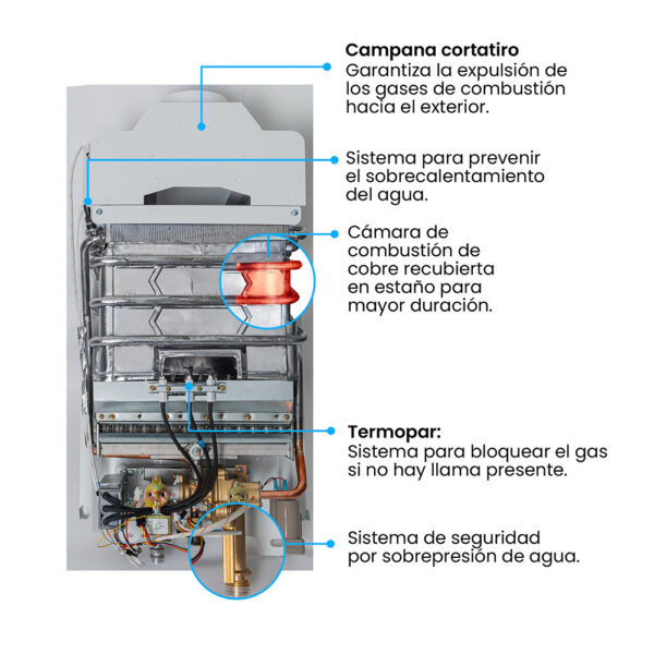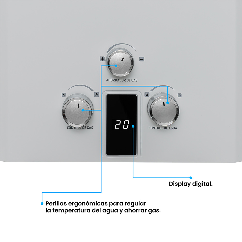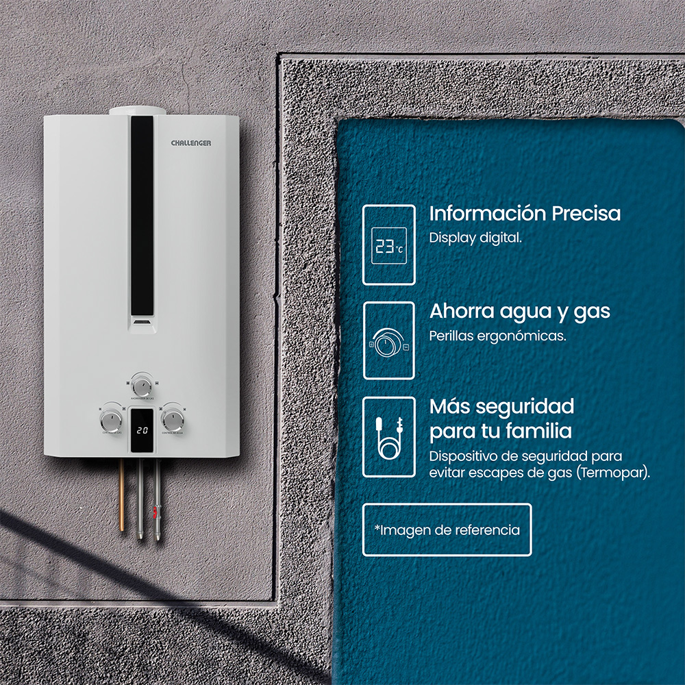 Calentador de paso a gas Challenger 10? Lts Tiro Natural. Acabado en color blanco, vidrio templado negro y perillas ergonómicas lo hacen lucir elegante y fácil de usar. Panel digital que indica la temperatura , encendido automático que te brinda agua caliente . Incluye múltiples sistemas de seguridad que cuidan el bienestar de tu familia. Además, incluye la función de ahorro de gas que te permite regular el consumo de gas sin sacrificar el confort.