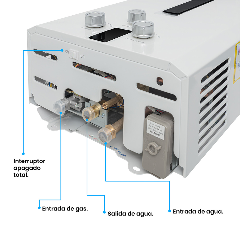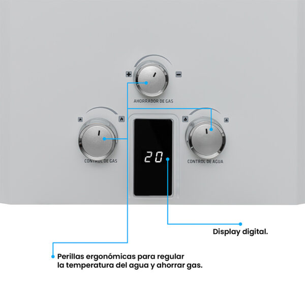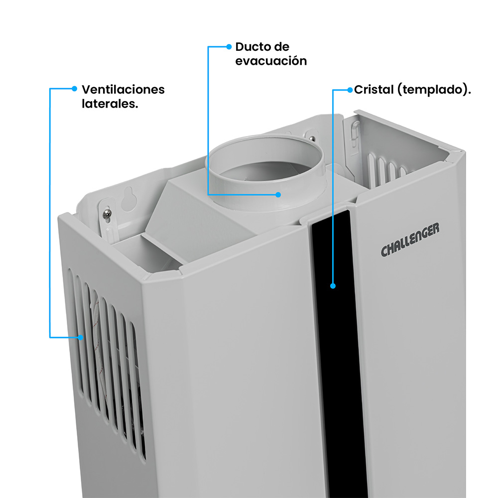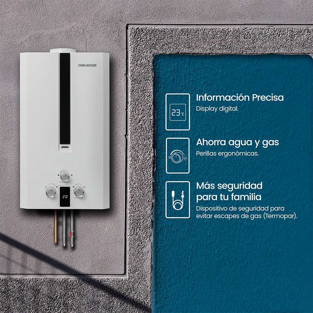 Calentador de paso a gas Challenger 12? Lts Tiro Natural. Acabado en color blanco, vidrio templado negro y perillas ergonómicas lo hacen lucir elegante y fácil de usar. Panel digital que indica la temperatura , encendido automático que te brinda agua caliente . Incluye múltiples sistemas de seguridad que cuidan el bienestar de tu familia. Además, incluye la función de ahorro de gas que te permite regular el consumo de gas sin sacrificar el confort.