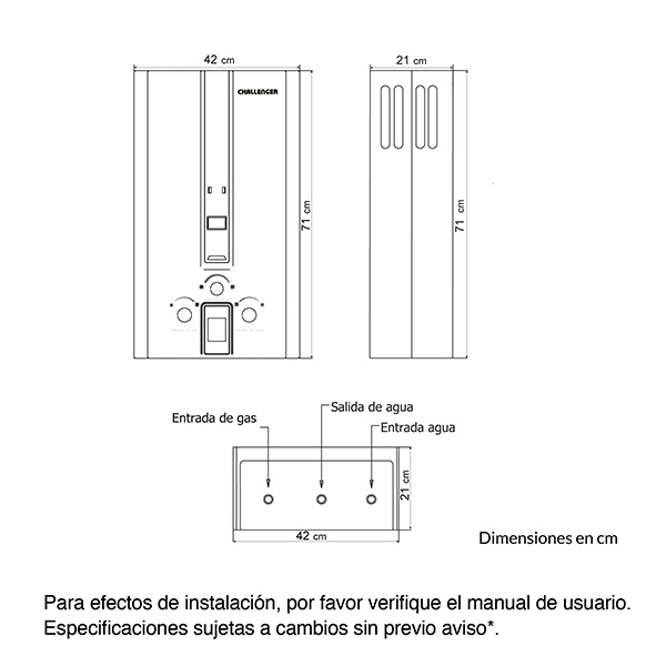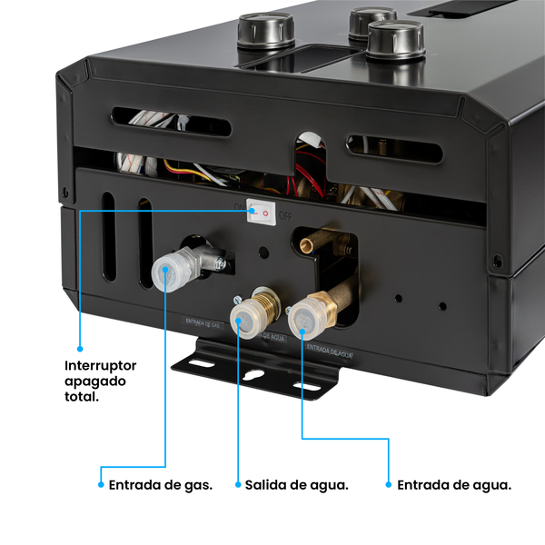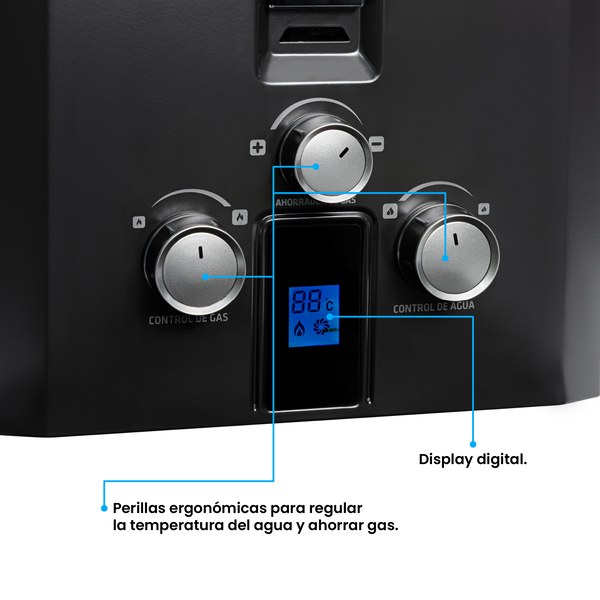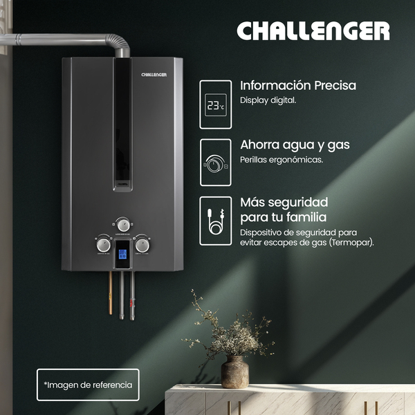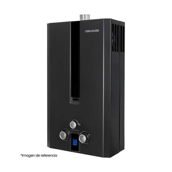 Calentador de paso a gas Challenger 6 Lts Tiro Forzado. Acabado en color negro, perillas ergonómicas lo hacen lucir elegante y fácil de usar. Panel digital que indica la temperatura , encendido automático que te brinda agua caliente . Incluye múltiples sistemas de seguridad que cuidan el bienestar de tu familia. Además, incluye la función de ahorro de gas que te permite regular el consumo de gas sin sacrificar el confort.